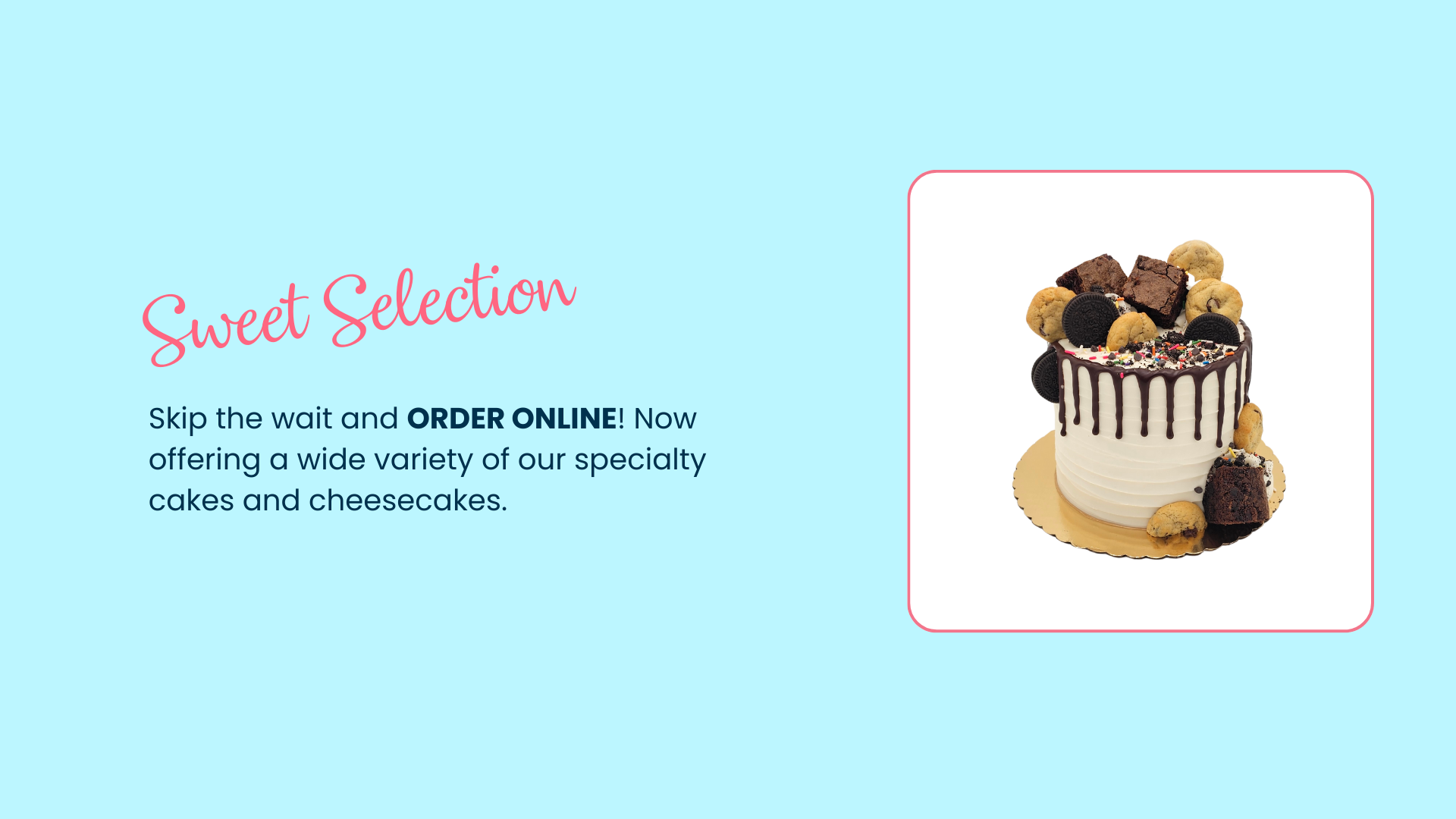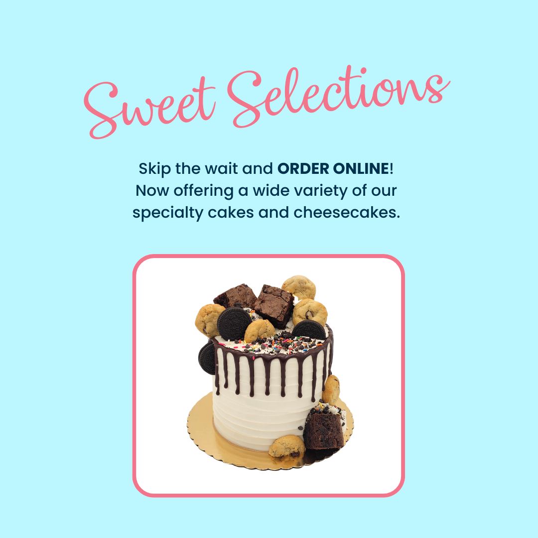 All online orders must be placed at least 3 days in advance. If your order is placed and we are unable to fulfill it, we will refund your order in full. All items must be refrigerated. We believe our cakes are best served at room temperature. We do not ship cakes and or cheesecakes. Orders cancelled within 7 days of pick-up are non-refundable.