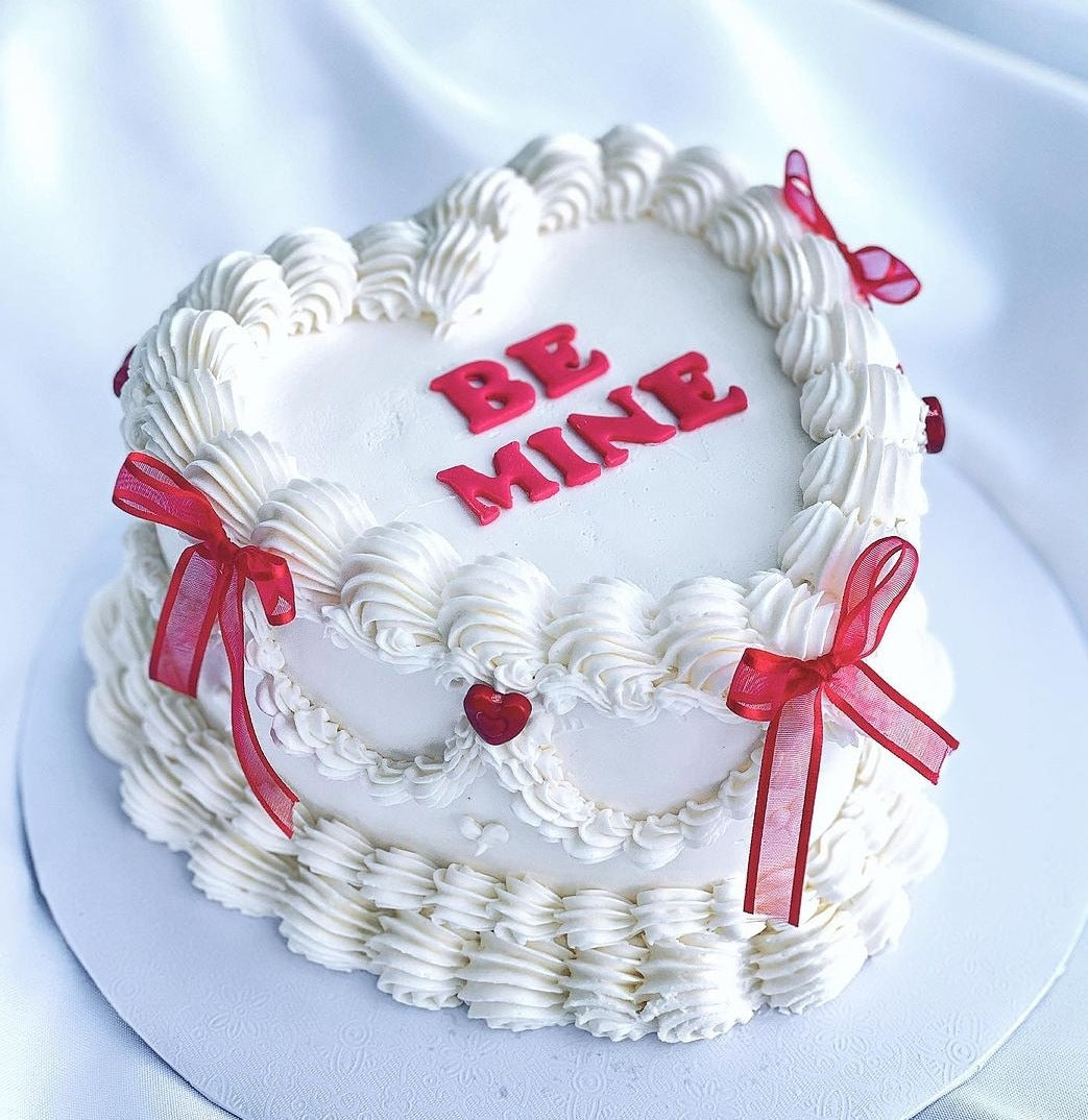 4" Mini Heart Cake for 2 with your choice of vanilla, chocolate, or red velvet cake with Kitty's Kakery staple decorations.